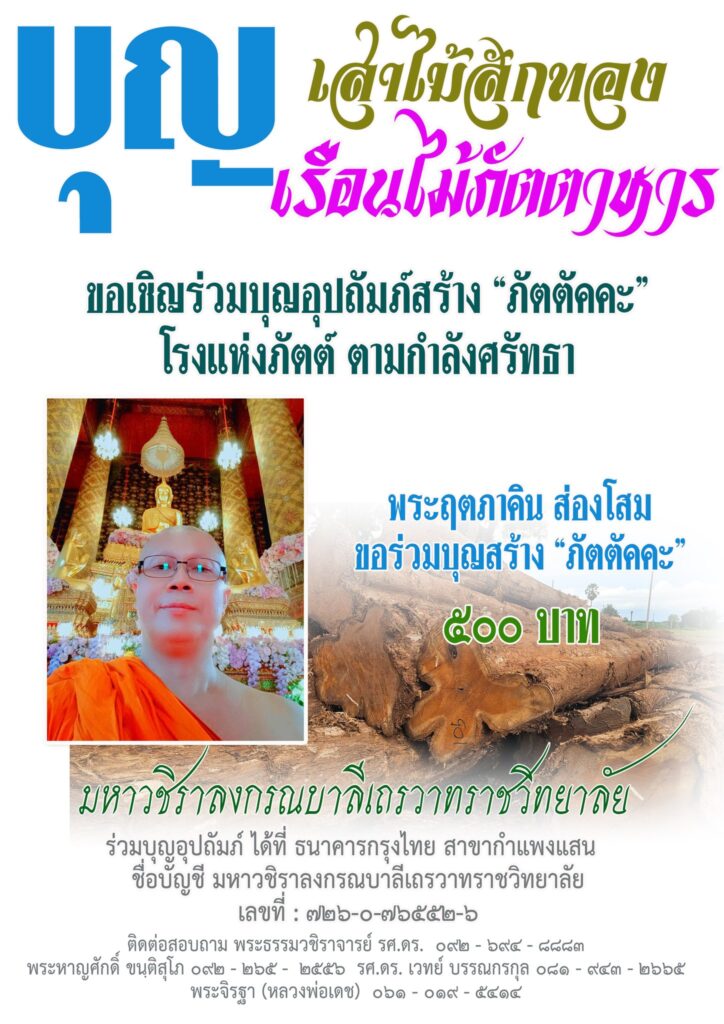 จักมีพิธียกเสาไม้สักทอง ภัตตัคคะ เร็ว ๆ นี้ ขอเชิญสาธุชน ร่วมเป็นเจ้าภาพ ร่วมบุญอุปถัมภ์ ได้ที่ ธนาคารกรุงไทย สาขากำแพงแสน ชื่อบัญชี มหาวชิราลงกรณบาลีเถรวาทราชวิทยาลัยเลขที่ : 726-0-76552-6