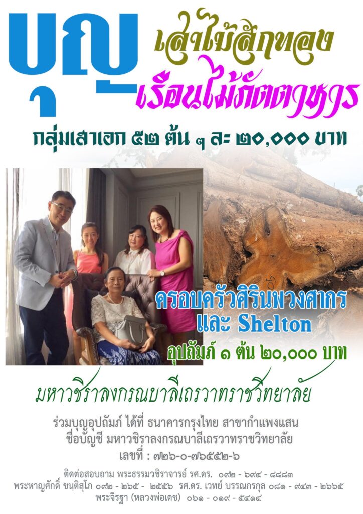 จักมีพิธียกเสาไม้สักทอง ภัตตัคคะ ๒๕ ตุลาคม นี้ ขอเชิญสาธุชน ร่วมเป็นเจ้าภาพ ร่วมบุญอุปถัมภ์ ได้ที่ ธนาคารกรุงไทย สาขากำแพงแสน ชื่อบัญชี มหาวชิราลงกรณบาลีเถรวาทราชวิทยาลัยเลขที่ : 726-0-76552-6