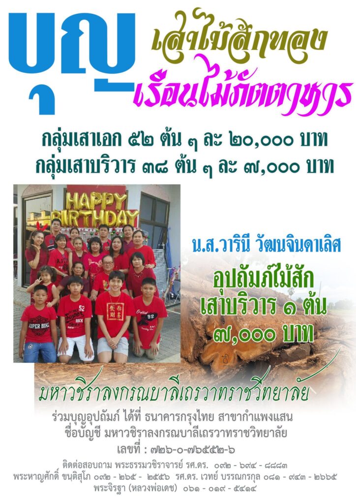 จักมีพิธียกเสาไม้สักทอง ภัตตัคคะ เร็ว ๆ นี้ ขอเชิญสาธุชน ร่วมเป็นเจ้าภาพ ร่วมบุญอุปถัมภ์ ได้ที่ ธนาคารกรุงไทย สาขากำแพงแสน ชื่อบัญชี มหาวชิราลงกรณบาลีเถรวาทราชวิทยาลัยเลขที่ : 726-0-76552-6