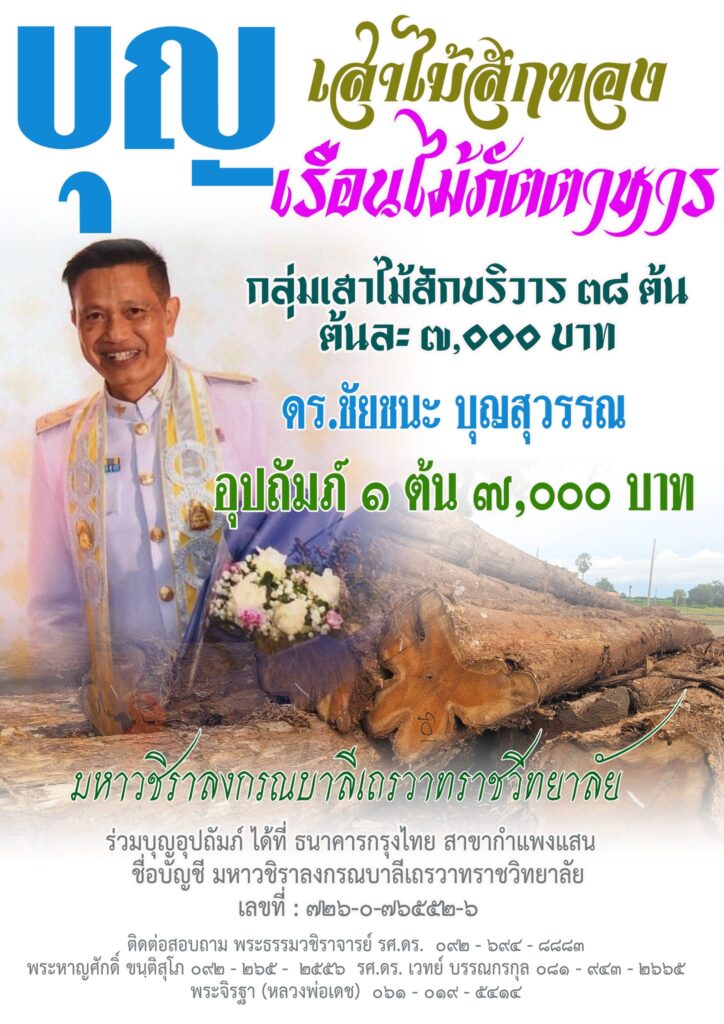 จักมีพิธียกเสาไม้สักทอง ภัตตัคคะ ๒๕ ตุลาคม นี้ ขอเชิญสาธุชน ร่วมเป็นเจ้าภาพ ร่วมบุญอุปถัมภ์ ได้ที่ ธนาคารกรุงไทย สาขากำแพงแสน ชื่อบัญชี มหาวชิราลงกรณบาลีเถรวาทราชวิทยาลัยเลขที่ : 726-0-76552-6
