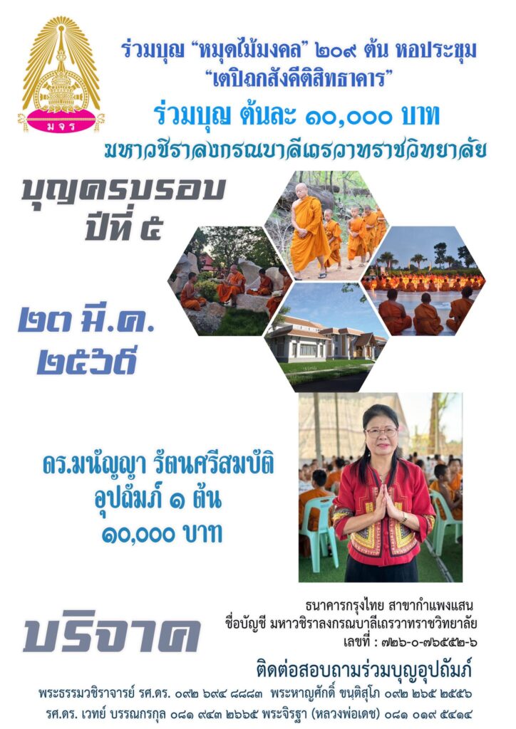 ขอเชิญสาธุชน ร่วมเป็นเจ้าภาพ ร่วมบุญอุปถัมภ์ ได้ที่ ธนาคารกรุงไทย สาขากำแพงแสน ชื่อบัญชี มหาวชิราลงกรณบาลีเถรวาทราชวิทยาลัยเลขที่ : 726-0-76552-6