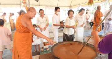 ดร.ภัสส์กุญช์ โสภณอนันต์กิจ ประธานในพิธีปรุงรสข้าวทิพย์ นำคณะเจ้าภาพข้าวทิพย์ จำนวน ๕ กระทะ ทำพิธีกวนข้าวทิพย์และปรุงรส เพื่อจัดเป็นของที่ระลึก