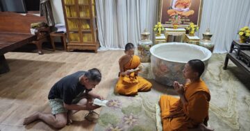 พระมหาเถระเจ้าซินติ้ง อายุ ๘๐ ปี ใบหน้ายิ้มแย้ม ได้ฟังเสียงสาธยายมนต์ภาษาบาลีตามแบบเถรวาท และพิเศษสุด คือสวดแปลเป็นทั้ง Thai English