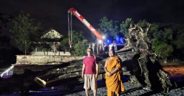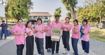 สาขาวิชาสังคมศึกษาจาก มจร. วิทยาลัยสงฆ์พุทธปัญญาศรีทวารวดี ไร่ขิง ปลูกต้นไม้และโยน EM บอล บำบัดน้ำรอบๆ อุทยานลานธรรมกัมมัฏฐาน