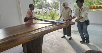 ท่านได้นำโต๊ะไม้ท่อนเดียวขนาดใหญ่ กว้าง ๑.๕ เมตร ยาว ๖ เมตร(เท่าที่ผมเห็นลายไม้ เนื้อไม้ สวยงามมาก อาจจะเป็นไม้มะค่าโมง หรือ ประดู่ ต้องผู้เชี่ยวชาญเรื่องไม้)