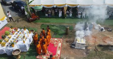 อุปถัมภ์น้ำปานะ น้ำอ้อย วันที่ ๖ ธันวาคม พิธีปักหมุดไม้มงคล โปรยข้าวตอกดอกไม้ เพชรนิลจินดาแก้วสารพัดนึก ในบริเวณพื้นที่่ก่อสร้าง